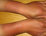 疱疹样皮炎患者皮肤以发生皮肤瘙痒、红斑、丘疹、风团、水胞等多形性皮损为特征表现。