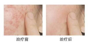 治疗前:郭女士,35岁,江苏人。发病初期,脸部泛发红丘疹,瘙痒难耐。在江苏当地医院就诊,涂擦药膏后致使病情加重,对当地医院失去信心。