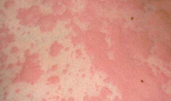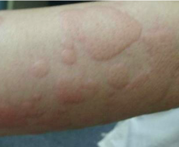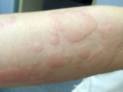 荨麻疹俗称风疹块,是由于过敏而引起的一种过敏性皮肤疾病。通常表现为鲜红色或是苍白色的风团。荨麻疹的发作呈间歇性,发作时瘙痒感剧烈,一段时间后瘙痒感消失、风团也消失。在发病时部分患者还会伴有恶心、呕吐、头痛、腹痛、腹泻等症状。