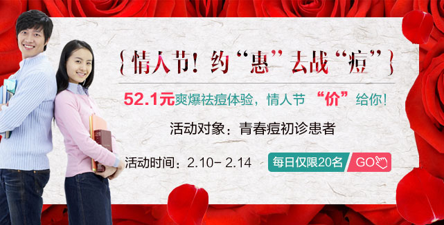 值此在情人节前夕,沈阳肤康(原东城)皮肤病医院为了让更多的青春痘患者享受美丽、自信的生活,不再为痘烦恼,特开展原价713元祛痘套餐体验价现仅需52.1元,助你轻松祛痘。本次活动旨在帮助更多的青春痘患者及时进行正规专业科学的治疗,迎接情人节的到来,让你美美的去约会。