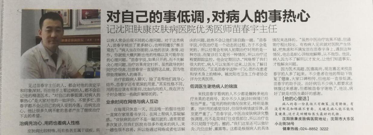 在每周只休息一天,而这唯一的假日他却一直窝在家里看书学习、在网上帮病人答疑解惑。“皮肤病的治疗不是一蹴而就的,通常需要多次复诊,但我们医院有很多外地来的病人,来一趟也很不容易,所以能通过网络或者电话解决的问题,就绝不会让他们亲自跑一趟。”苗春宇说,中医治疗是一个动态的过程,方子不会是死的,所以经常病人初期治疗时用的是一种方法,而复诊后又是另一种,所以治疗过程要跟踪监控,他会定期回访,“网络帮了我们很大的忙,病人可以发图片过来,让医生了解目前的状况。”正是苗春宇这种一门心思扑在患者和学术身上的精神,被沈阳市卫生工作者协会评为优秀医师。